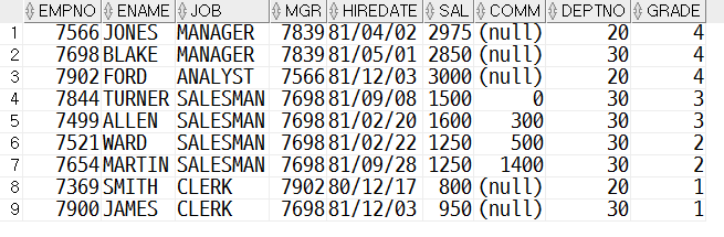 SELECT E.*, S.GRADE FROM EMP E, SALGRADE S WHERE E.SAL BETWEEN S.LOSAL AND S.HISAL ORDER BY GRADE DESC;> join문 사용 안해서 where로 들어왔네 나머지는 같다.