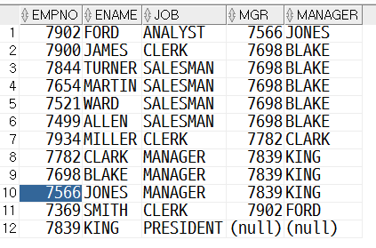 SELECT E.EMPNO, E.ENAME, E.JOB, E.MGR, M.ENAME MANAGER FROM EMP E LEFT OUTER JOIN EMP M ON E.MGR = M.EMPNO;> left outer join을 썼는데, 나는 아직 여기에 익숙치가 않아서. 직접 해보자