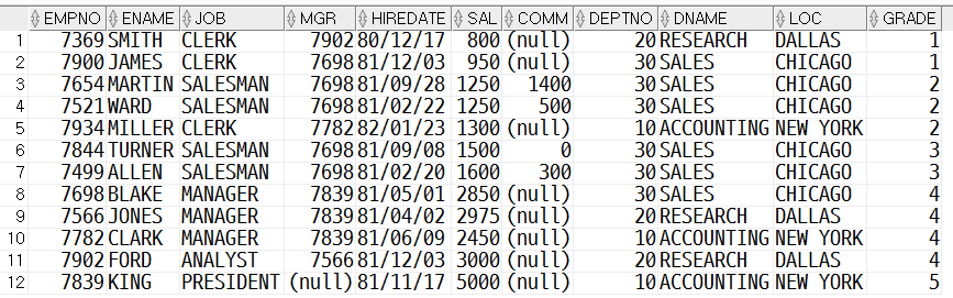 SELECT E.*,D.DNAME,D.LOC,S.GRADE FROM EMP E, DEPT D, SALGRADE S WHERE E.SAL BETWEEN LOSAL AND HISAL AND E.DEPTNO=D.DEPTNO ORDER BY S.GRADE;> grade도 나오고 location도 나오니까, 테이블 3개가 연결되어야 했던거야