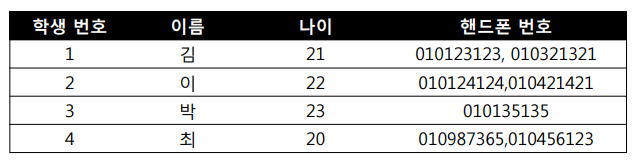 도메인은 모두 원자값이어야 합니다. 핸드폰 번호에 2가지가 들어가 있기 때문에 제1 정규형을 만족할 수 없게 됩니다. (관계형 데이터 베이스의 경우 기본적으로 도메인은 모두 원자값이기 때문에 제1 정규형은 지켜져 있습니다)