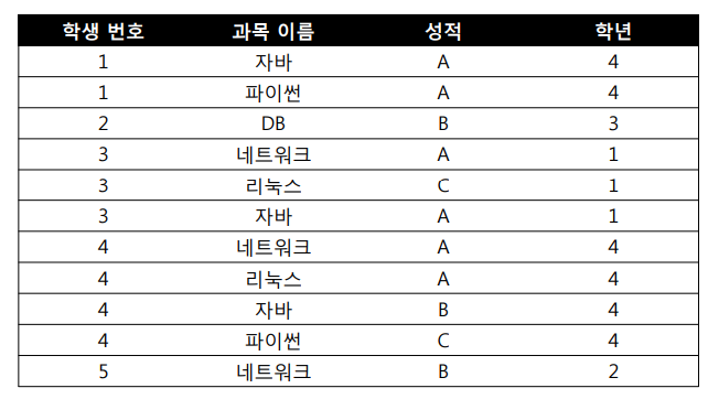 - 삭제 이상 : 학생 번호가 2번인 학생의 과목에 대한 성적을 삭제할 경우 학생 번호와 학년 등 모든 정보가 같이 삭제되어 학생의 정보 자체가 사라짐