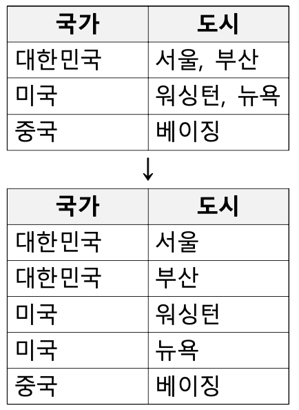 다음과 같이 위쪽 릴레이션을 아래쪽 릴레이션으로 정규화를 하였을 때 어떤 정규화 작업을 한 것인가?