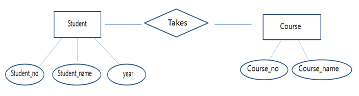 - 예를 들어, 수강을 뜻하는 Takes는 학생과 과목간의 "수강"이라는 관계를 갖습니다.