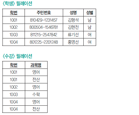 - e.g. <수강>릴레이션(테이블)이 <학생>릴레이션(테이블)을 참조하고 있으므로 <학생>릴레이션의 학번은 기본키이고, <수강>릴레이션의 학번은 외래키이다