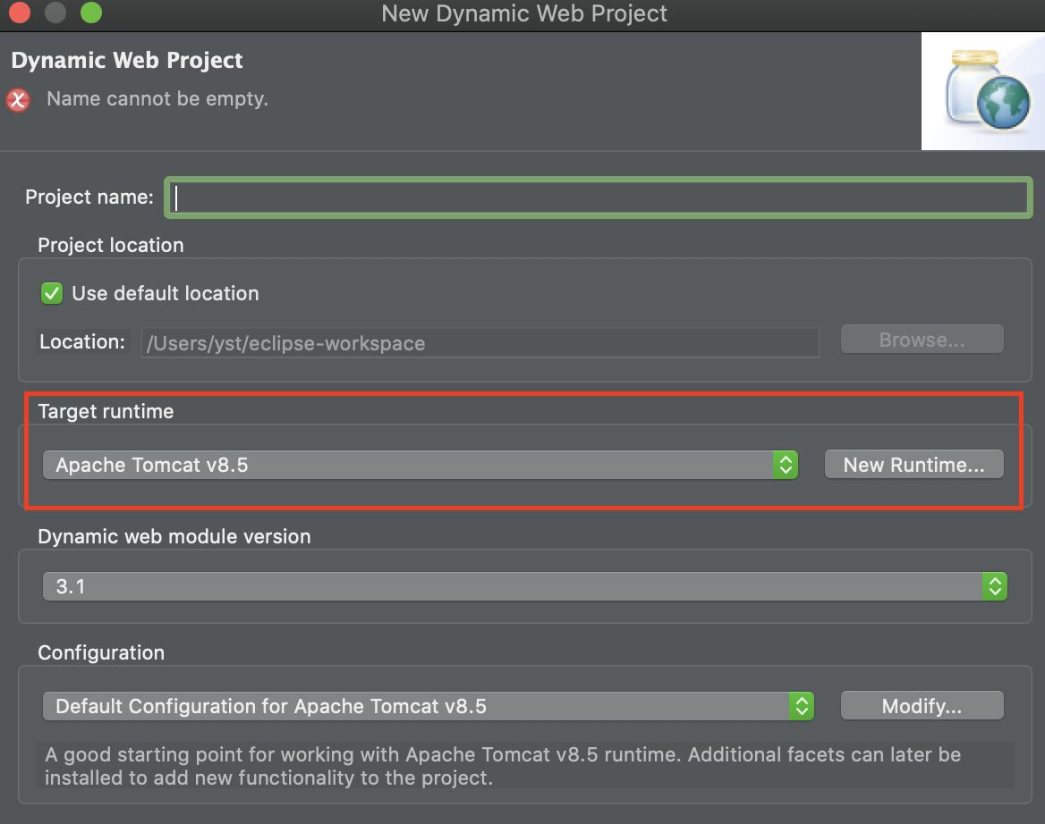 Target runtime을 Apache Tomcat v8.5로 설정, 그 밑의 Configuration은 자동으로 설정된다.