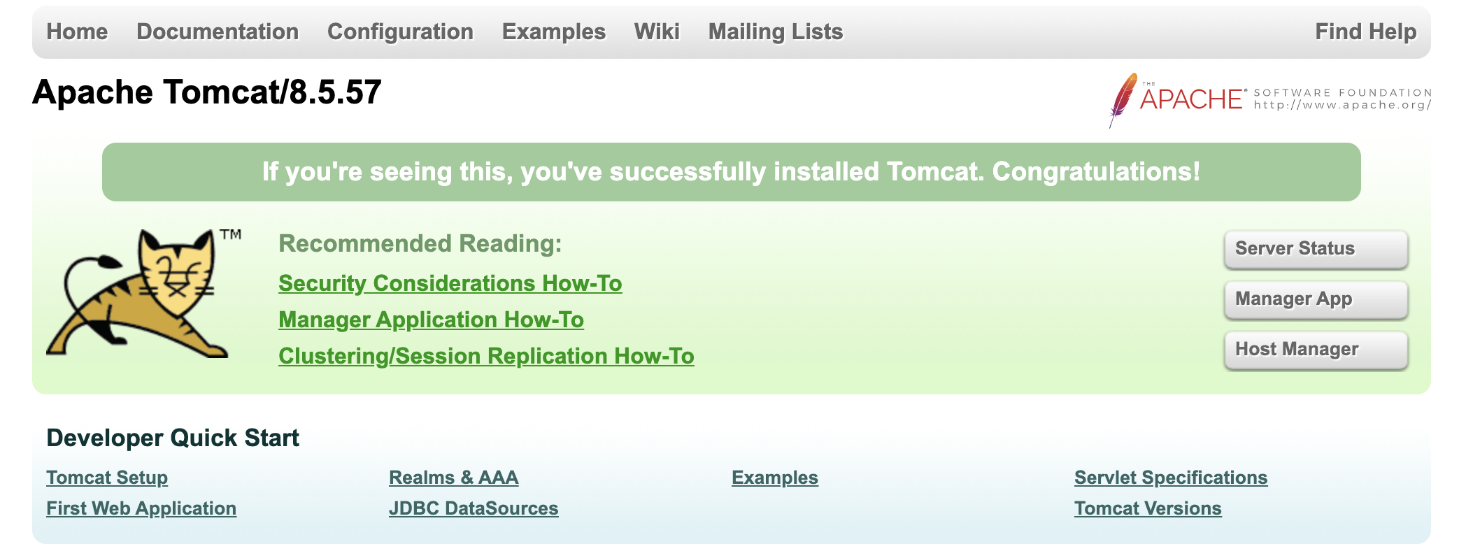 ※주의: 띄어쓰기 ('사용자 이름' 띄고 '권한 수정할 폴더 위치')5 % sudo chmod +x /Library/Tomcat/bin/*.sh Tomcat폴더가 가진 모든 sh 확장자 파일 실행 가능하도록 변경 6 % sudo /Library/Tomcat/bin/startup.sh tomcat 실행 이 과정들을 무사히 거쳤을 때, localhost:8080을 주소창에 입력하면 다음과 같은 화면이 나타날 것이다.
