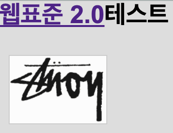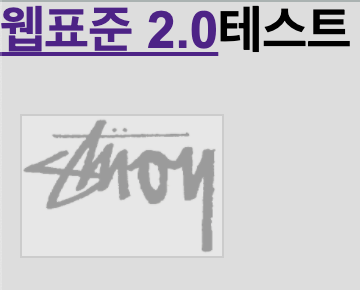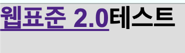 <!DOCTYPE html> <html> <head> <meta charset="UTF-8"> <title>css test.</title> <link href="mystyle.css" rel="stylesheet" type="text/css"> <style> </style> </head> <body> <div class="mission_a"> <h1><a href="#">웹표준 2.0</a>테스트</h1> </div> </body> </html>위의 파일들을 실행하면, 다음과 같은 화면이 출력된다.