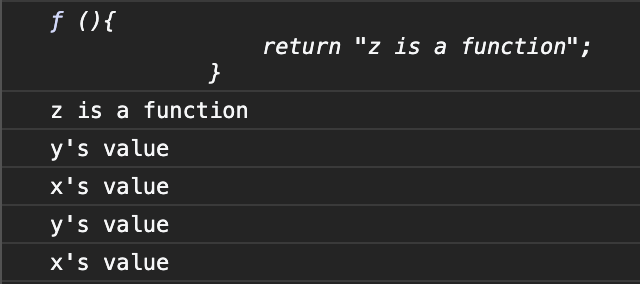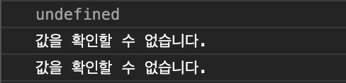 //Object Class var obj = { x : "x's value", "y" : "y's value", //큰 따옴표가 있든, 없든 key는 String으로 저장되는듯? z : function(){ return "z is a function"; }, //var x로 넣으면 지역 변수로 여기 안에서만 쓸 수 있게 한정된다. } console.log(obj.z); // 이건 들어가 있는 그 자체를 뽑아내고 console.log(obj["z"]()); // 이건 return값을 뽑아낸다. console.log(obj.y); console.log(obj.x); console.log(obj["y"]); console.log(obj["x"]); //undefined 출력될 때 출력값 변경 var x; console.log(x); //지금은 undefined var xx = x||"값을 확인할 수 없습니다."; var v = obj.b||"값을 확인할 수 없습니다."; console.log(v); console.log(xx);