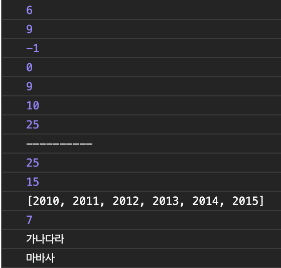 //특정 문자 index 구하기, 있으면 > index / 없으면 > -1 console.log('LouisVuitton'.indexOf('ui', 3)); console.log('MaisonMargiela_메zong마르지엘라'.indexOf('giela', 5)); console.log('MaisonMargiela_메zong마르지엘라'.indexOf('종', 7)); console.log('MaisonMargiela_메zong마르지엘라'.indexOf('')); console.log('MaisonMargiela_메zong마르지엘라'.indexOf('', 9)); console.log('MaisonMargiela_메zong마르지엘라'.indexOf('', 10)); console.log('MaisonMargiela_메zong마르지엘라'.indexOf('', 27)); // 총길이가 17인가봐, 그래서 17 이상은 다 17로 뜬다. var MM = "MaisonMargiela_메zong마르지엘라"; console.log('----------'); console.log(MM.length); console.log('MaisonMargiela_메zong마르지엘라'.lastIndexOf('메')); // 이건 구조가 어떻게 되어있는건지 모르겠네 //문자열을 지정한 구분자로 쪼개어 배열로 돌려받기 function splitString(str, [separtor]){ var strArr = str.split(separtor); return strArr; } var str1 = "2010, 2011, 2012, 2013, 2014, 2015"; strArr1 = str1.split(","); console.log("["+ strArr1 +"]"); //문자열에서 지정한 범위 뽑아내기 var namest = "가나다라마바사"; var subst1 = namest.substring(0,4); var subst2 = namest.substring(4,7); console.log(namest.length); // 7개네,,, 흠,,, console.log(subst1); console.log(subst2);