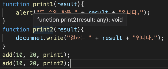 //JSON 객체 var strBill = JSON.stringify(bill); // var bill을 JSON형태로 만드는 명령어 console.log(strBill); var billAgain = JSON.parse(strBill); // 다시 var형태로,,,, console.log(billAgain); // call back function function add(num1, num2, callback){ var result; result = num1 + num2; callback(result); } function print1(result){ alert("두 수의 합은 " + result + "입니다."); } function print2(result){ document.write("결과는 " + result + "입니다."); } add(10, 20, print1); add(10, 20, print2); //이거 안하면 print1(sum(10,20)); //이렇게 써야하는데, 식이 복잡해지면 callback f(x)가 소중해질듯?