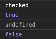 결과값 var attr_checked = $("#checked").attr("checked"); var prop_checked = $("#checked").prop("checked"); console.log(attr_checked); console.log(prop_checked); var attr_unchecked = $("#unchecked").attr("checked"); var prop_unchecked = $("#unchecked").prop("checked"); console.log(attr_unchecked); console.log(prop_unchecked);