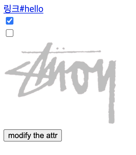 <body> <a href="#hello" id="a">링크#hello</a> <br> <input type="checkbox" id="checked" checked="checked"> <br> <input type="checkbox" id="unchecked" > <br> <img id="sample_img" src="./images/stuoy_nuki1.png" width="200px" data-userattr1="사용자지정속성값" data-userattr2="123456789"> <br> </body>
